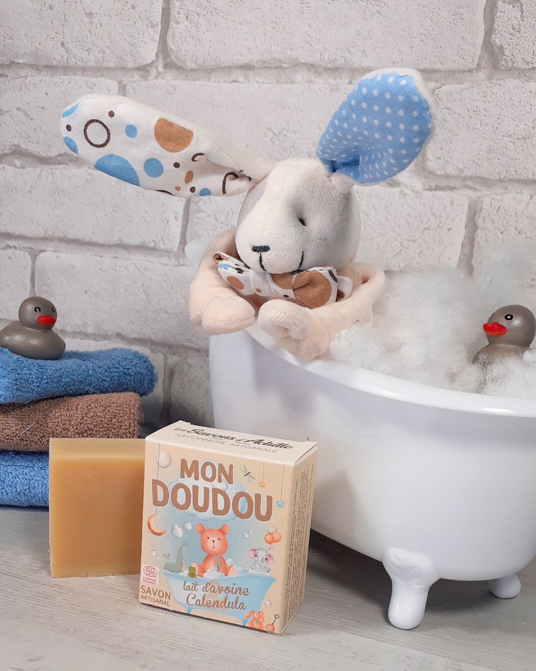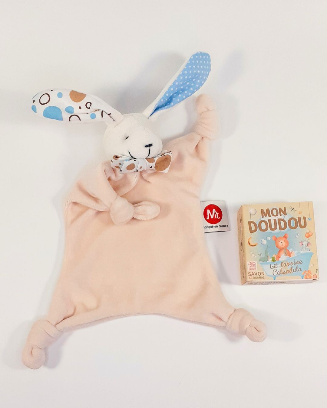 Ce coffret est composé de notre doudou lapin iconique au visage brodé à la main et d'un savon aux huiles végétales de la savonnerie Les Savons d'Achille : 2 entreprises lexoviennes pour un coffret 100% made in Lisieux !